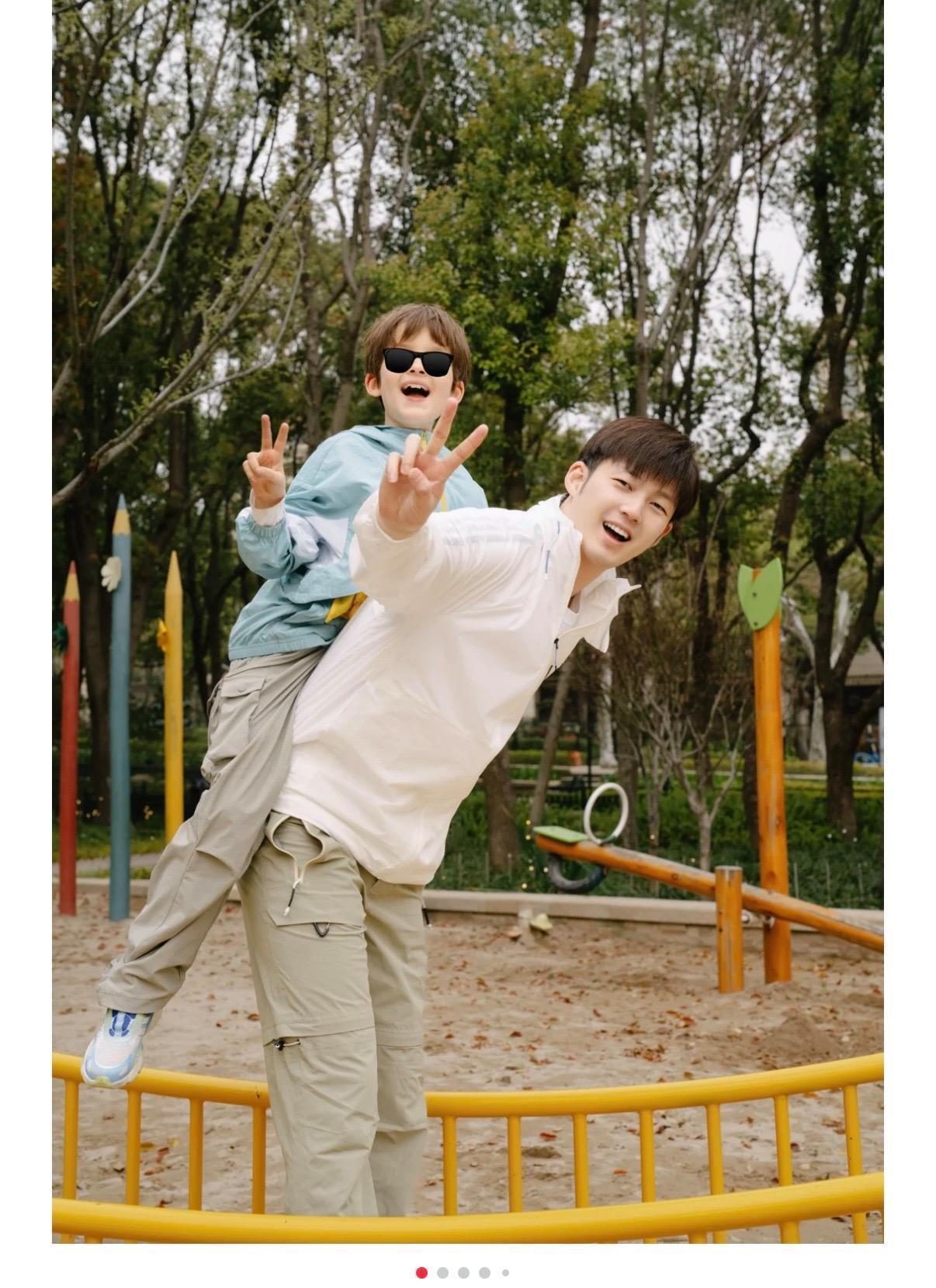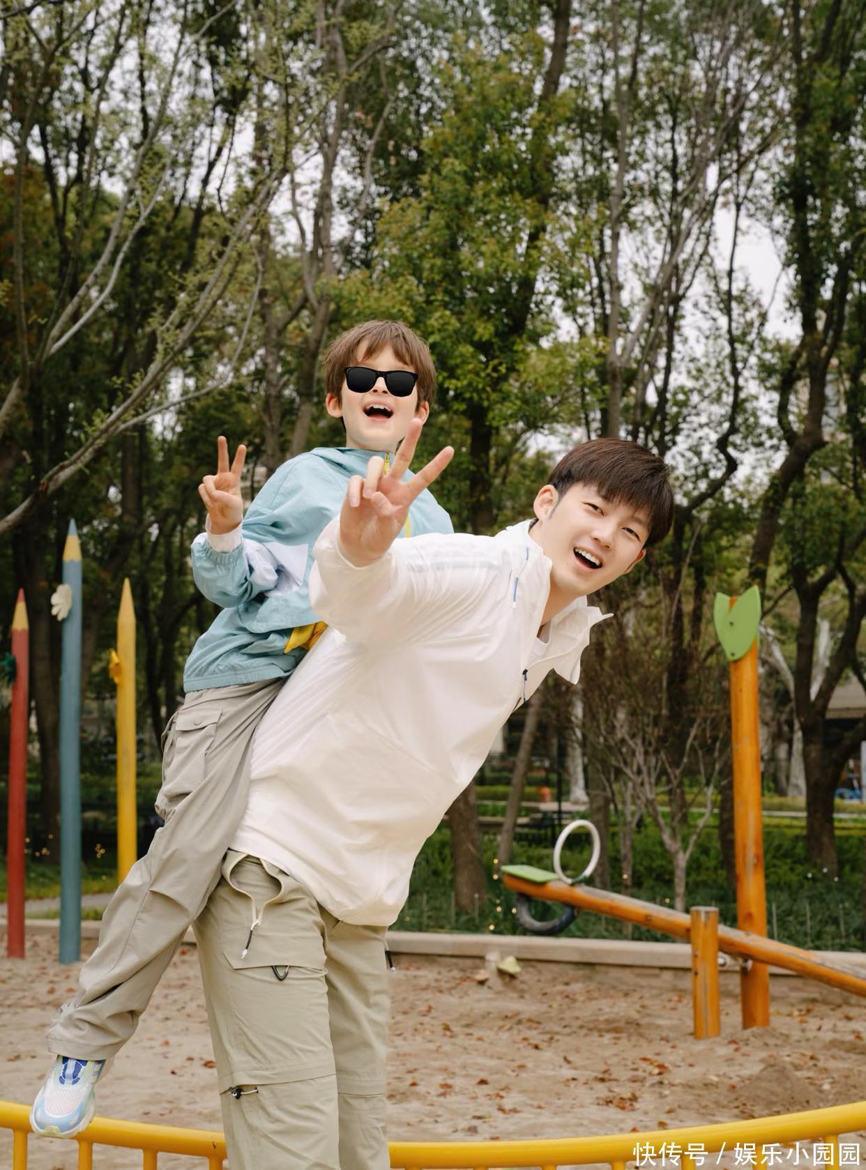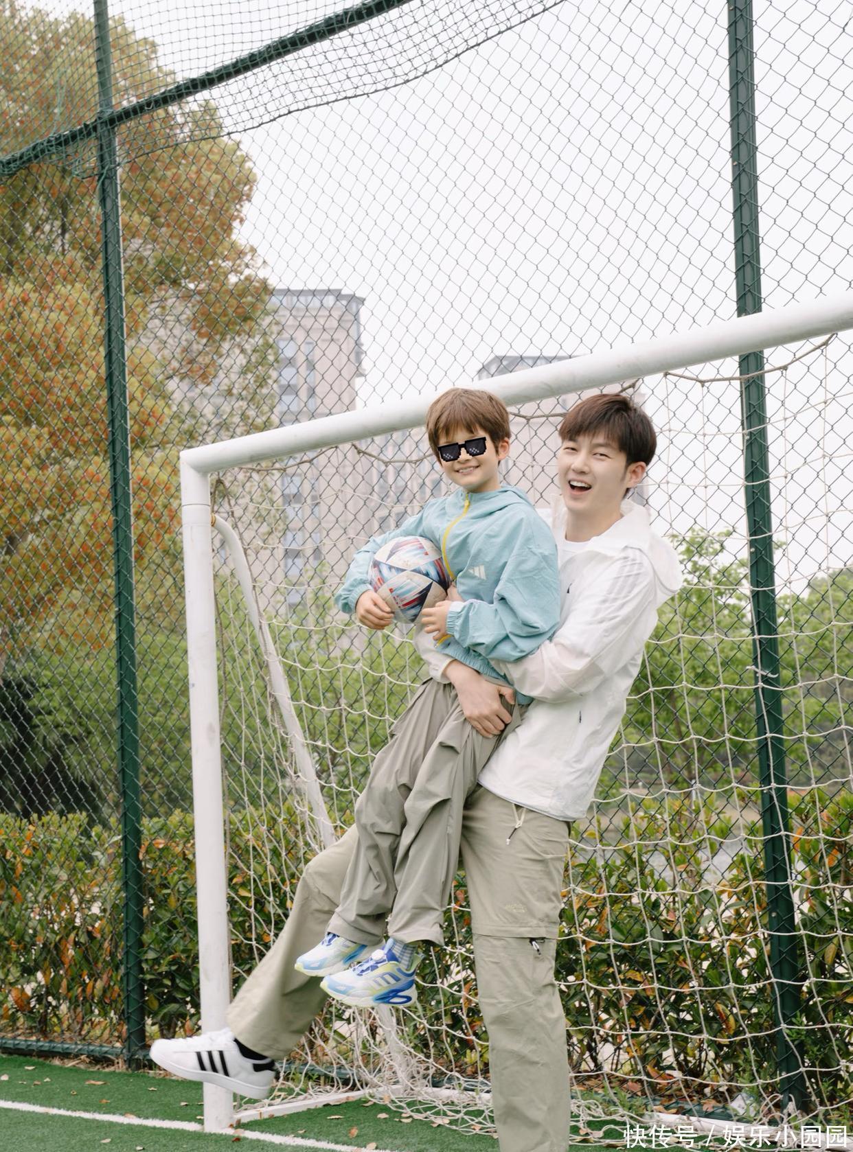 遗传了爸爸的身高上风、还有姆妈的高颜值,加上天生的混血长相尤利斯便是个小帅哥。父子俩穿亲子装、在公园里玩耍,画面确切太温馨。