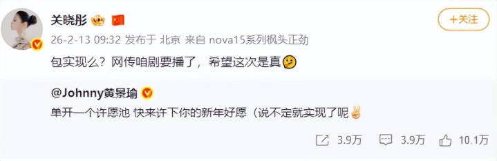 而黄景瑜的动态本色是让网友许一个新年愿望,关晓彤在转发之后配上了一句: