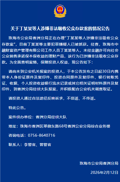 珠海市公安局香洲分局正在办理“丁某某等东说念主涉嫌罪犯接收公众进款案”,当今丁某某等主要行恶嫌疑东说念主已被合手获。经查,珠海市中融钞票资产惩处有限公司责任主说念主员丁某某等东说念主,未经金融许可向社会公众销售容或保本保收益的搭理居品,该行径已涉嫌罪犯接收公众进款。为全面查明案情,保险投资东说念主权力,现公告如下: