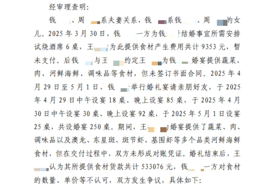 根据判决书,王雇主条目钱雇主一方支付海鲜、猪肉、蔬菜等食材用度一共534565元。钱雇主一方合计,婚典本日,王雇主从未向该指定东谈主员交货,也莫得东谈主验收,王雇主确乎为婚宴提供了部分食材,可用度如故无法核算,轮廓计划应该用度在300000元以下,其显示招供的金额为270000元。