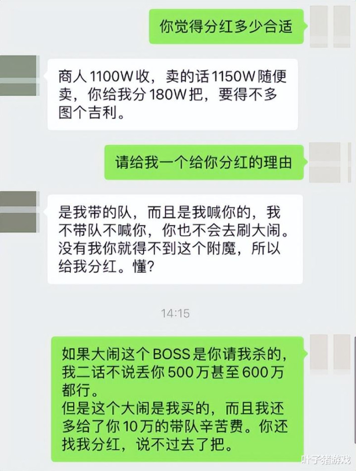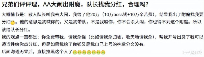 据他先容,他付给带大闹的散东谈主队长20万,其中10万是BOSS钱,10万是给队长的贫穷费。成果他出了附魔,队长便条件分成,事理是“我方带队+主动邀请去大闹。”