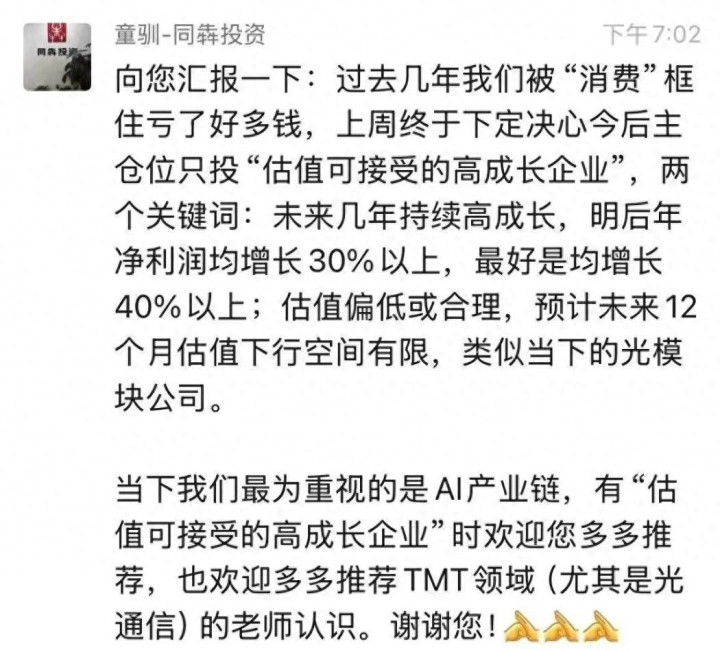 握续的净值压力,最终压垮了这位苦守耗损十余年的大佬。童驯明确表态,今后主仓位只投“估值可罗致的高成长企业”,两个关键词:异日几年握续高成长,明后年净利润均增长30%以上,最好是均增长40%以上;估值偏低或合理,瞻望异日12个月估值下行空间有限,访佛当下的光模块公司。当下最为爱重的是AI产业链。
