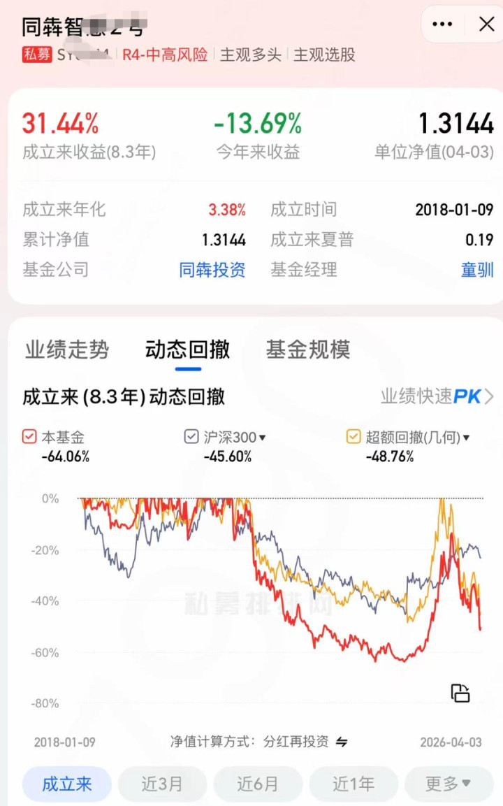 第三方平台数据炫耀,童驯处罚的同犇奢睿X号居品,限制4月3日,本年以来收益-13.69%,居品以致出现过单周暴跌18%的顶点行情,自2018年拔擢以来,最大回撤高达64%。