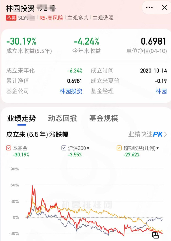 但是,推行却极端焦炙,他旗下私募居品事迹惨淡。以一只2020年拔擢的林园投资X号为例,限制4月10日,本年以来收益-4.24%,净值仅0.6981,拔擢以来年化-6.34%,苦守多年,依旧深陷赔本。